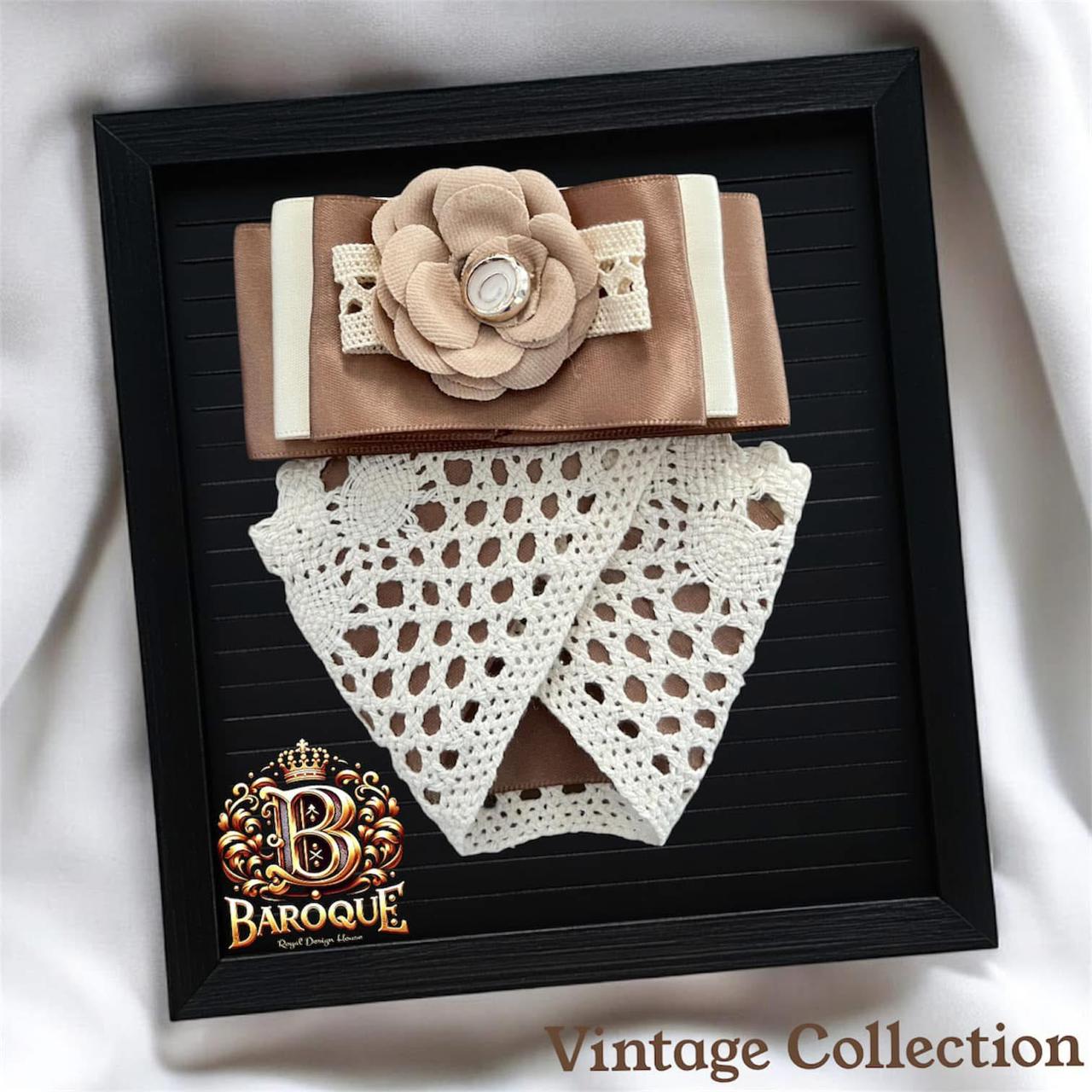 A refined brooch made of delicate ivory crochet and soft beige satin. Finished with a unique flower centrepiece, this multi-textured design adds a graceful touch to any elegant outfit.